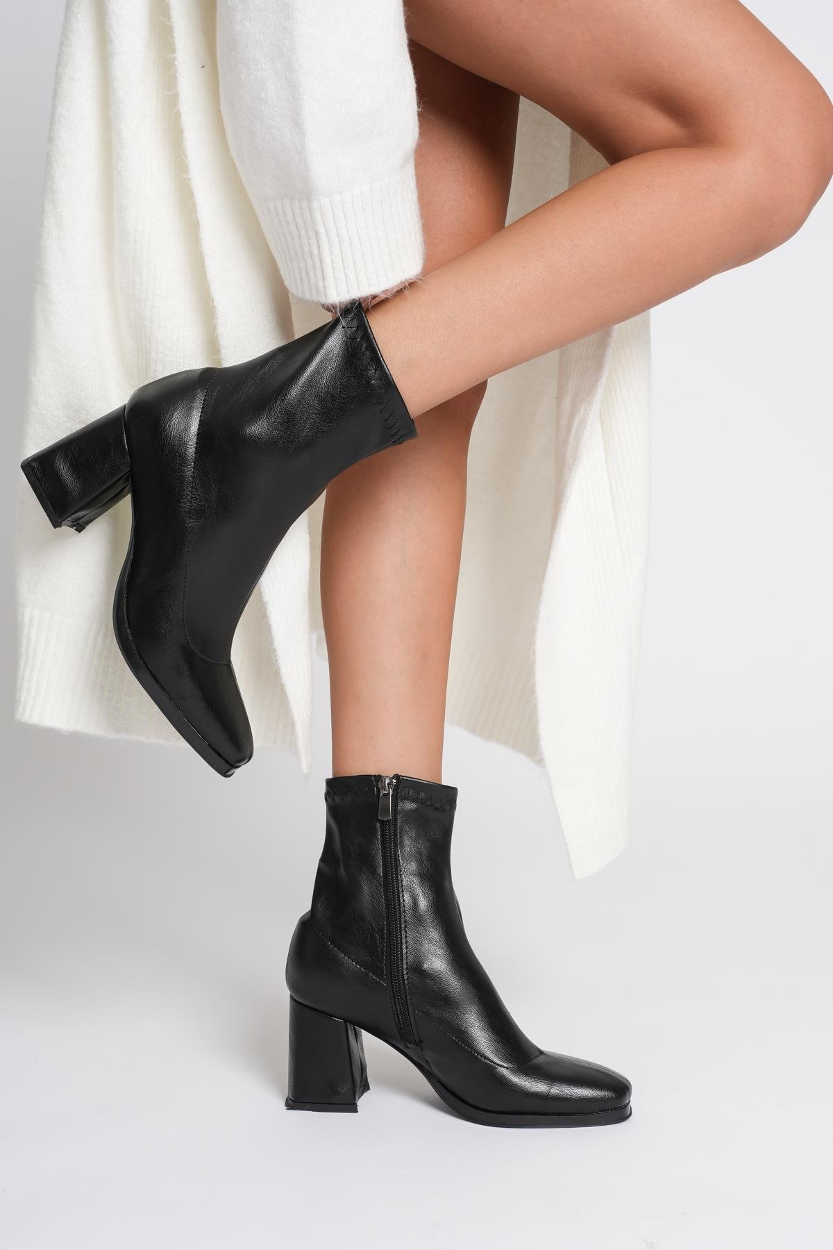 Mado Siyah Küt Burunlu Kalın Topuklu Streç Bot