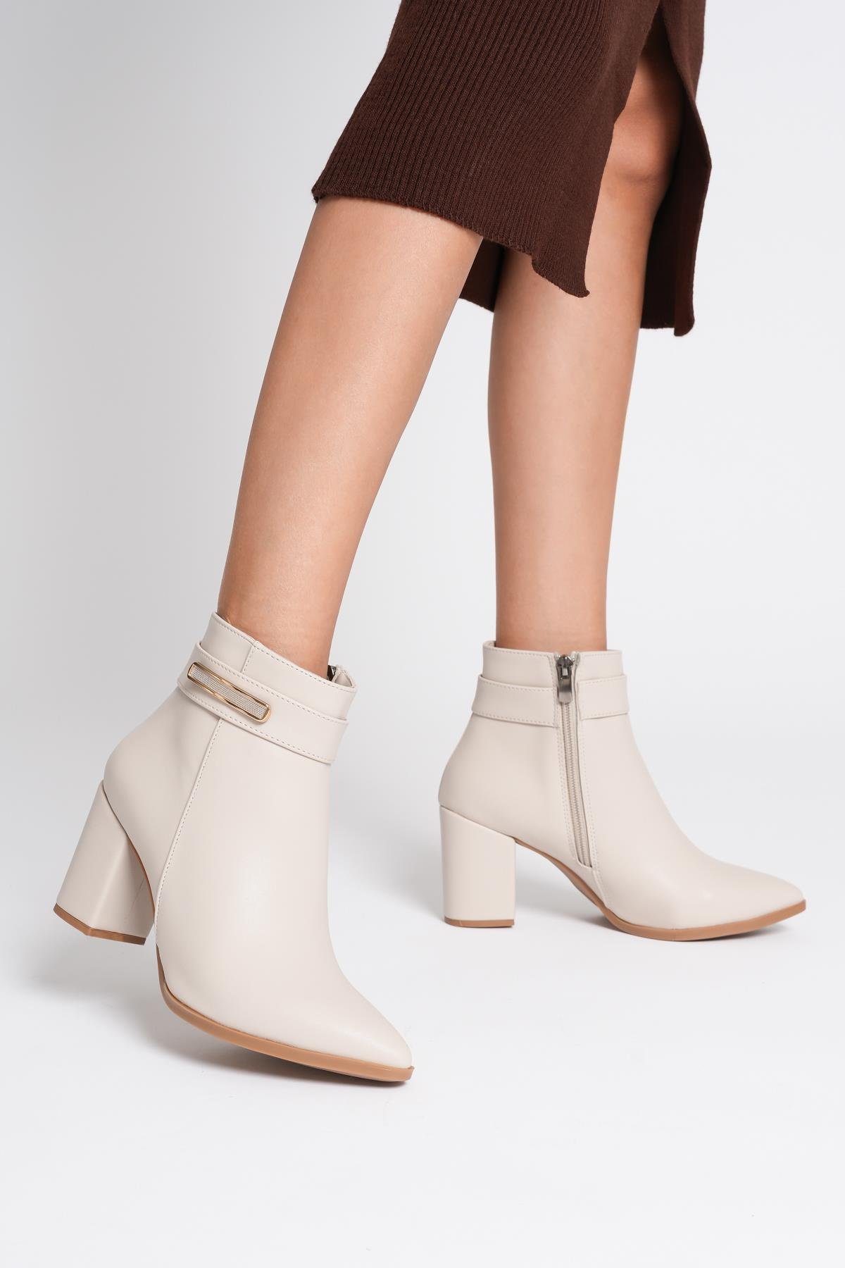 Marya Bej Cilt Fermuarlı Sivri Burunlu Kalın Topuklu Bot
