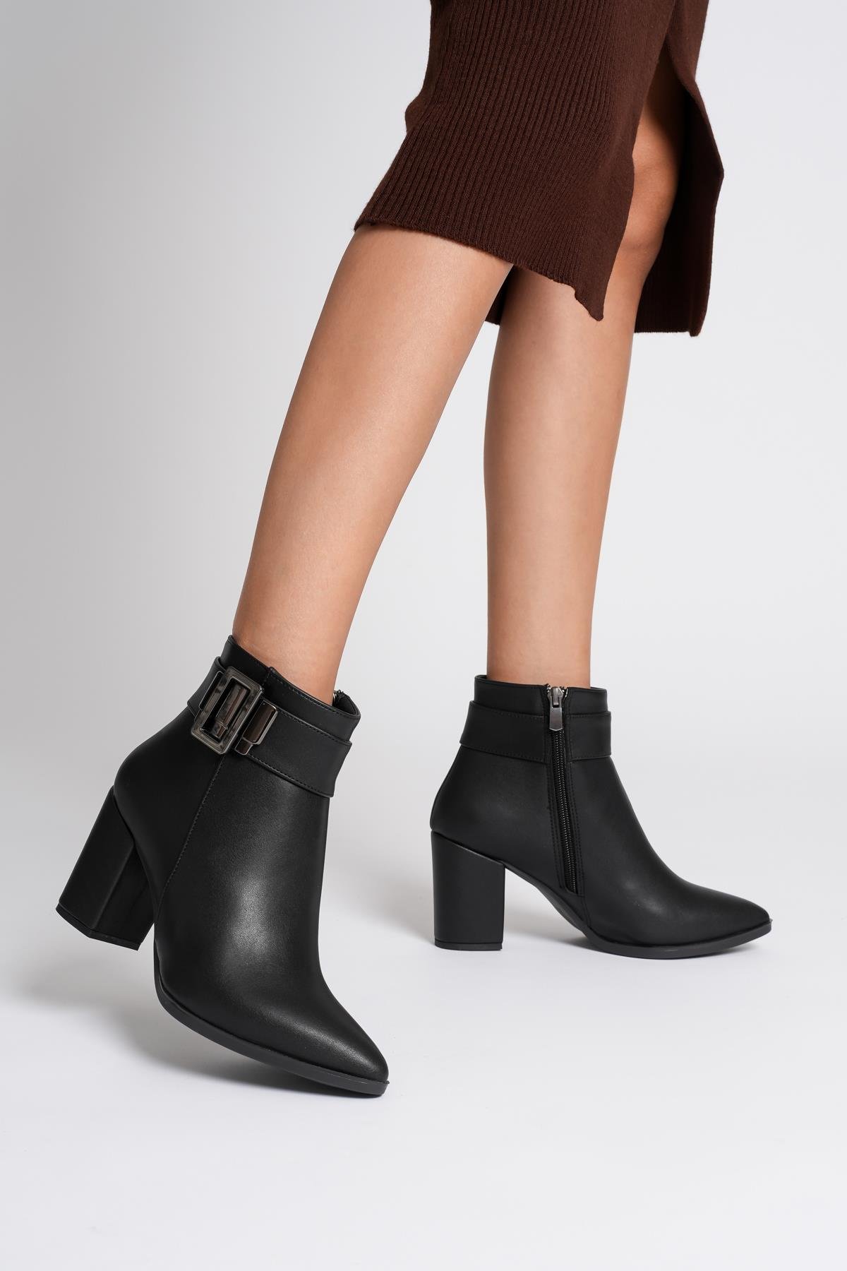 Simley Siyah Cilt Tokalı Sivri Burunlu Kalın Topuklu Bot