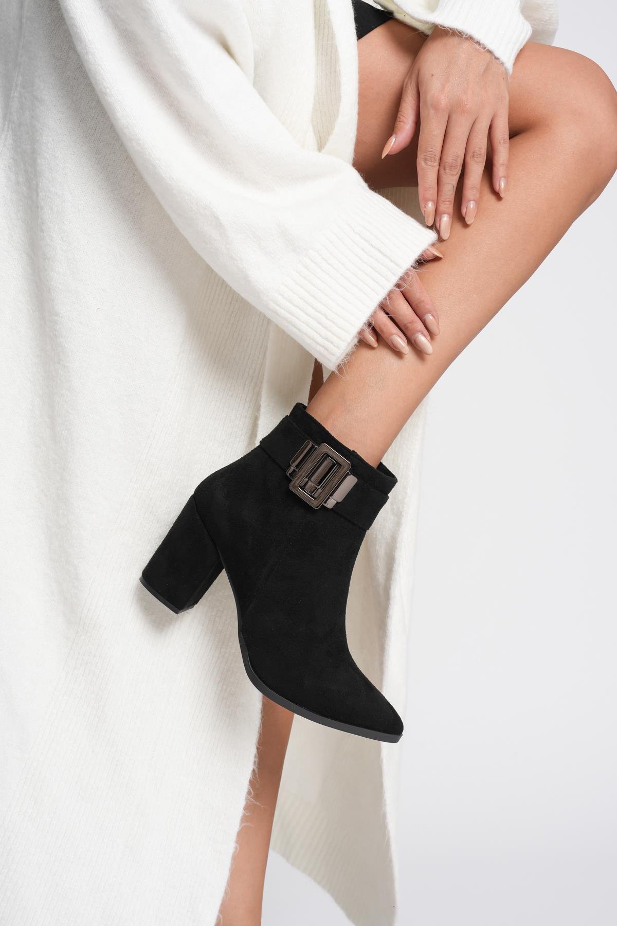 Simley Siyah Süet Tokalı Sivri Burunlu Kalın Topuklu Bot