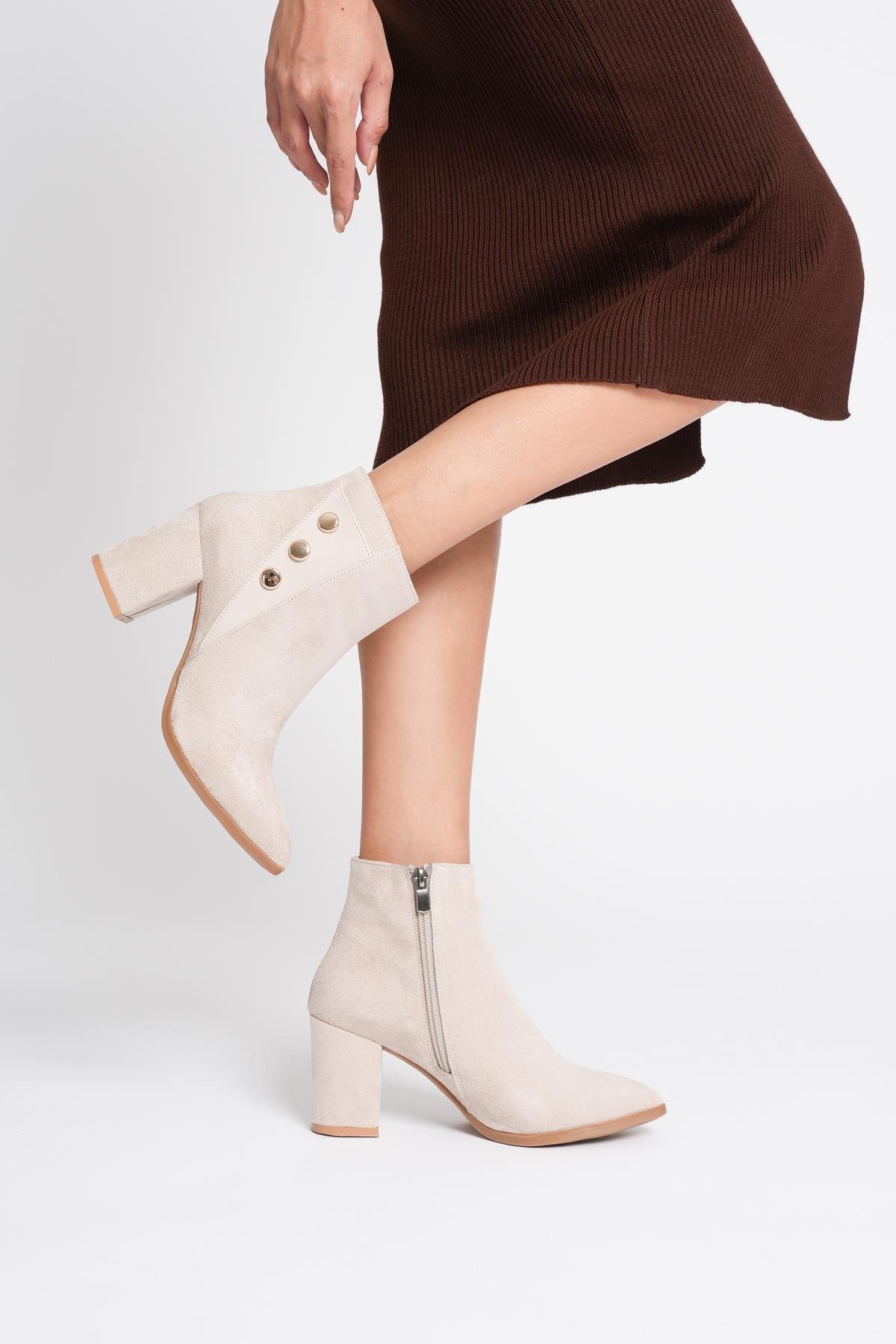 Sole Bej Süet Tokalı Sivri Burunlu Kalın Topuklu Bot